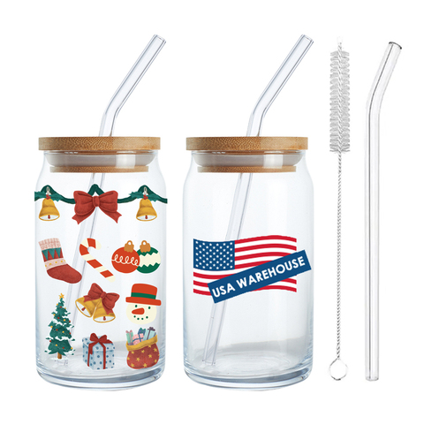 مستودع الولايات المتحدة الأمريكية مخصص فارغة شفافة 16 أونصة 20 أونصة زجاج شرب الماء عصير الشاي القهوة علبة أكواب مع غطاء الخيزران والقش الزجاجي
